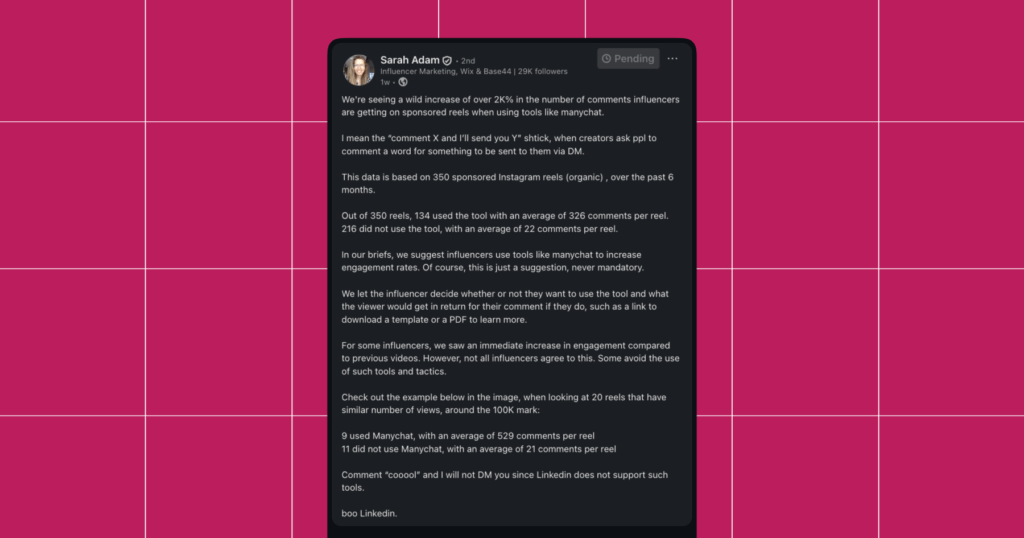 Sarah Adam, Head of Influencer Marketing at Base44, pulled data from 350 sponsored Instagram reels across the past six months. The difference? Whether or not creators used Manychat.